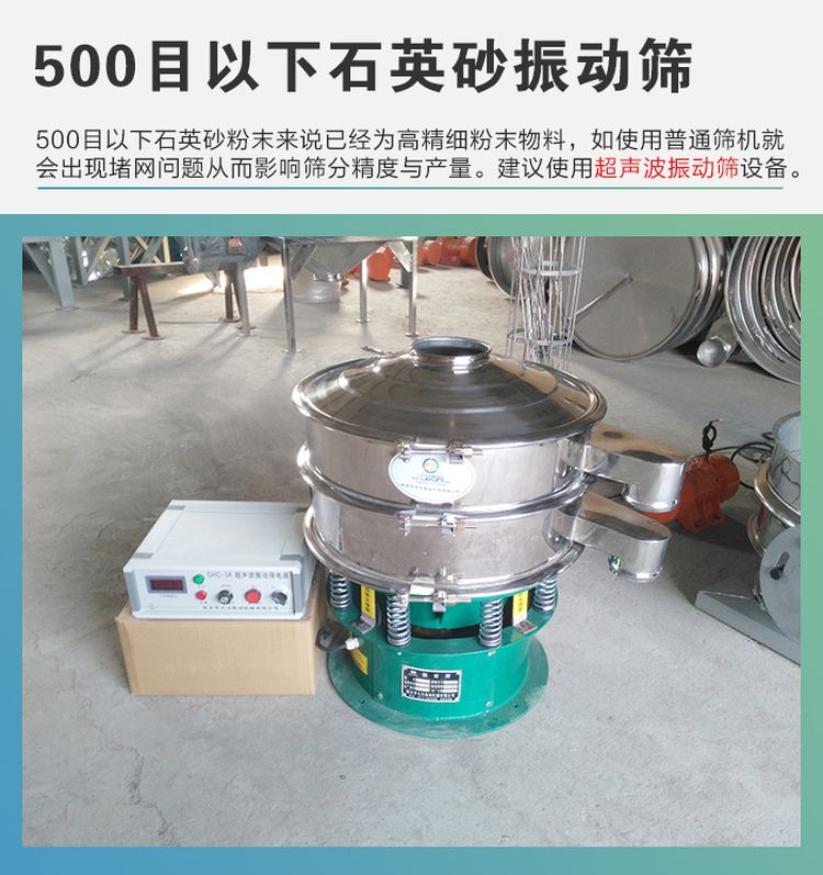 對于500目以下石英砂粉末來說已經(jīng)為高精細粉末物料,如使用普通篩機就會出現(xiàn)堵網(wǎng)問題從而影響篩分精度與產(chǎn)量。對于該類型的石英砂產(chǎn)品就需要使用到另一款篩分設(shè)備-超聲波振動篩。該系列篩機的清網(wǎng)裝置使用的是超聲波系統(tǒng),開啟后篩面會形成一個高頻低振幅的超聲振動波,使高精細粉末低空懸浮在篩面粗從而實現(xiàn)清網(wǎng)及解決堵網(wǎng)問題。