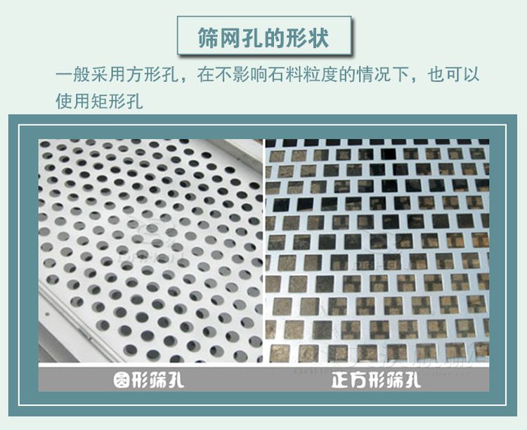 篩網(wǎng)一般采用方形孔,小網(wǎng)眼是用來(lái)防止堵塞孔網(wǎng)的,如果孔塞嚴(yán)重,在不影響石料粒度的情況下,也可以使用矩形孔。但是,從使用周期的角度來(lái)看,必須注意網(wǎng)眼的方向,否則會(huì)影響篩網(wǎng)的使用周期。
