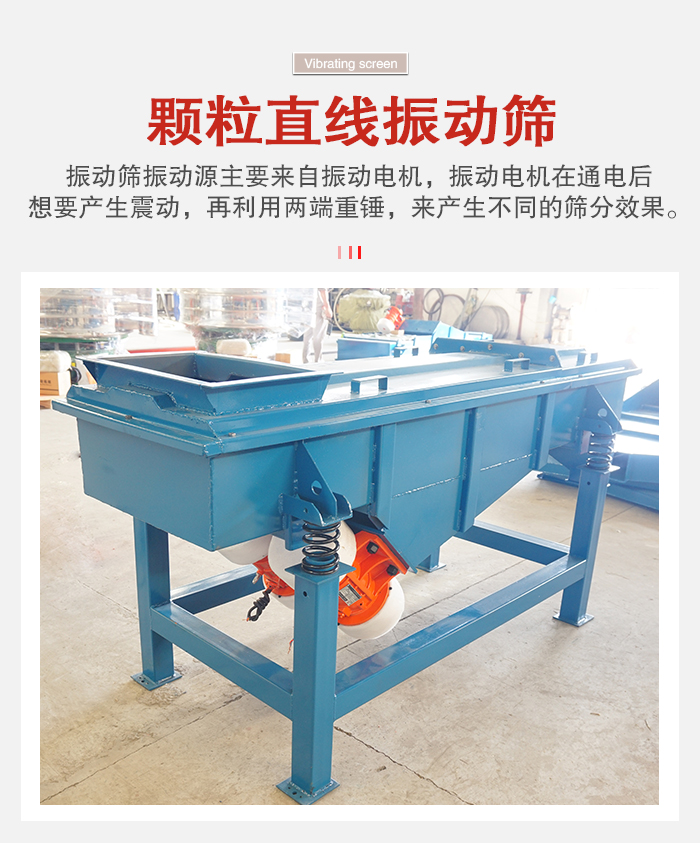 顆粒直線振動(dòng)篩振動(dòng)源主要來(lái)自振動(dòng)電機(jī),振動(dòng)電機(jī)在通電后想要產(chǎn)生震動(dòng),再利用兩端重錘,來(lái)產(chǎn)生不同的篩分效果。