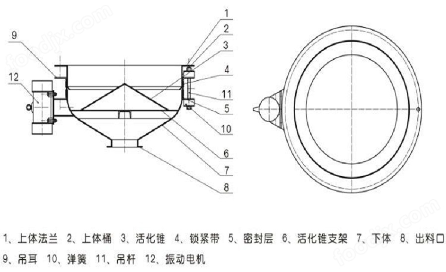 將振動由機接通由源攝動由機起振。且產生的激振力使給料斗下體在水平方向產生強列的振動此振動通過錐面或球面活化器將水平激振力分解為法向力和切向力法向力呈放射狀傳遞到物料深處切向力使物料受剪從而消除倉內物料的起拱使物料像流水一樣從出料口排出。切斷電源振動電機停振排料可停止。