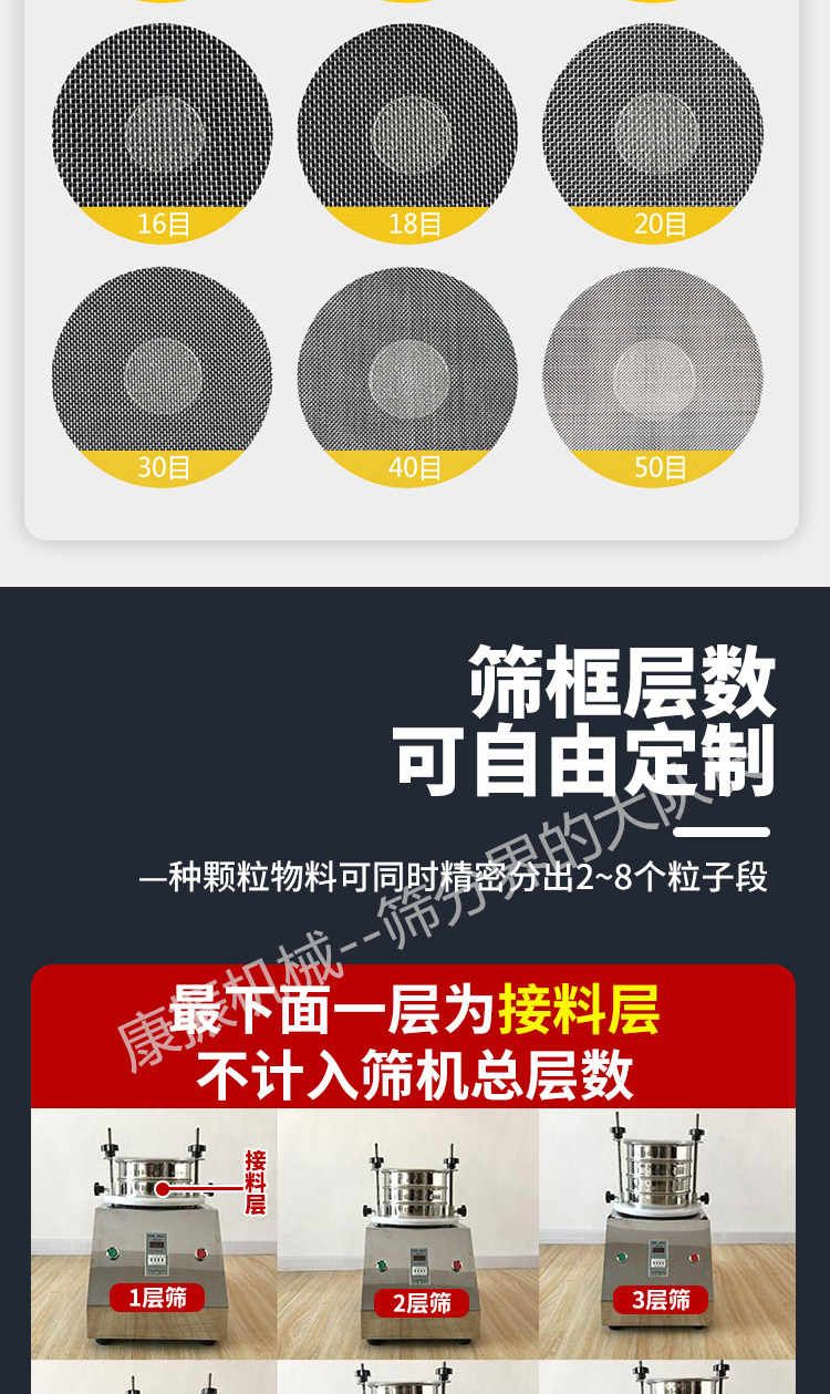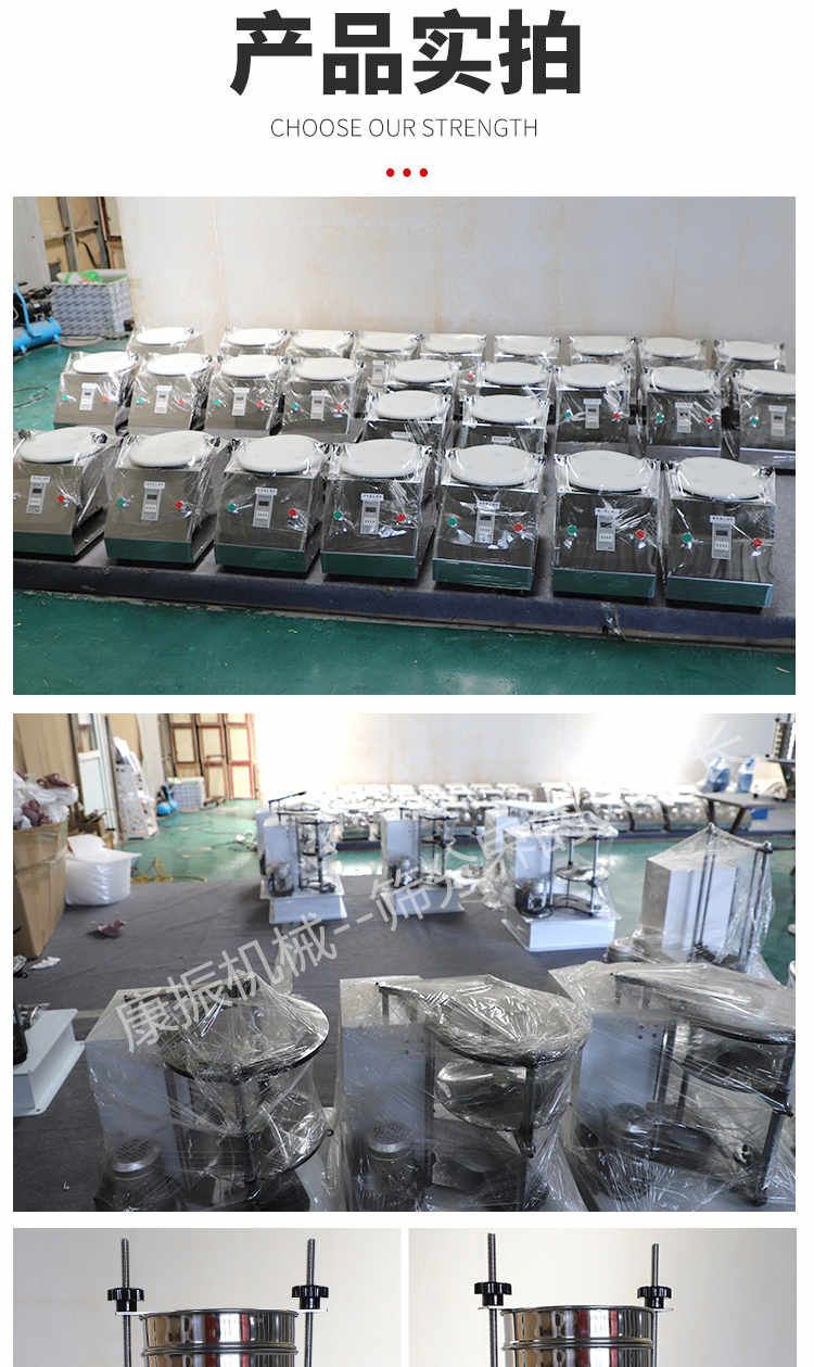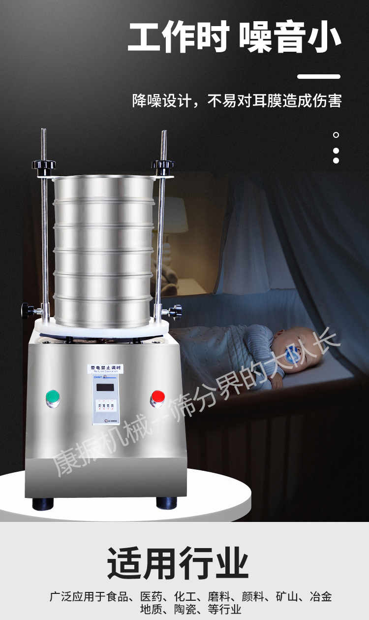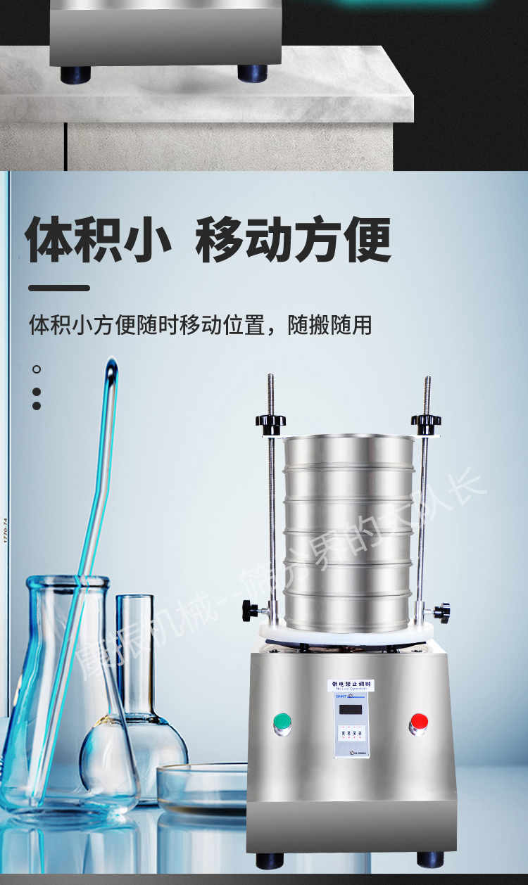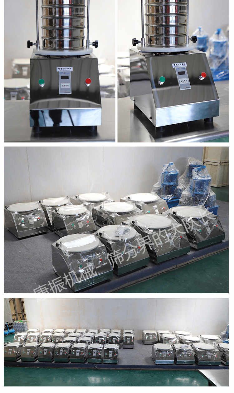 “機械篩分”將篩子按孔徑大小疊在一起,給料放在頂上一層篩子上,并加上蓋和底盤,一般疊56個篩子。然后放在機械振篩器上進行機械振動篩分。通常,振動時間為20分鐘。檢測篩分質量時,再用振篩器振篩器振篩5分鐘,如每分鐘篩下量小于0.2%試驗樣量即為合格,對于粗粒物料,過篩率小于1%即可。如篩分過程中損失量超過總篩分量的0.5%時,試驗必須重新取樣進行。為避免損失和延長篩分時間,有時在開始篩分時先用細的篩子將粉塵篩除