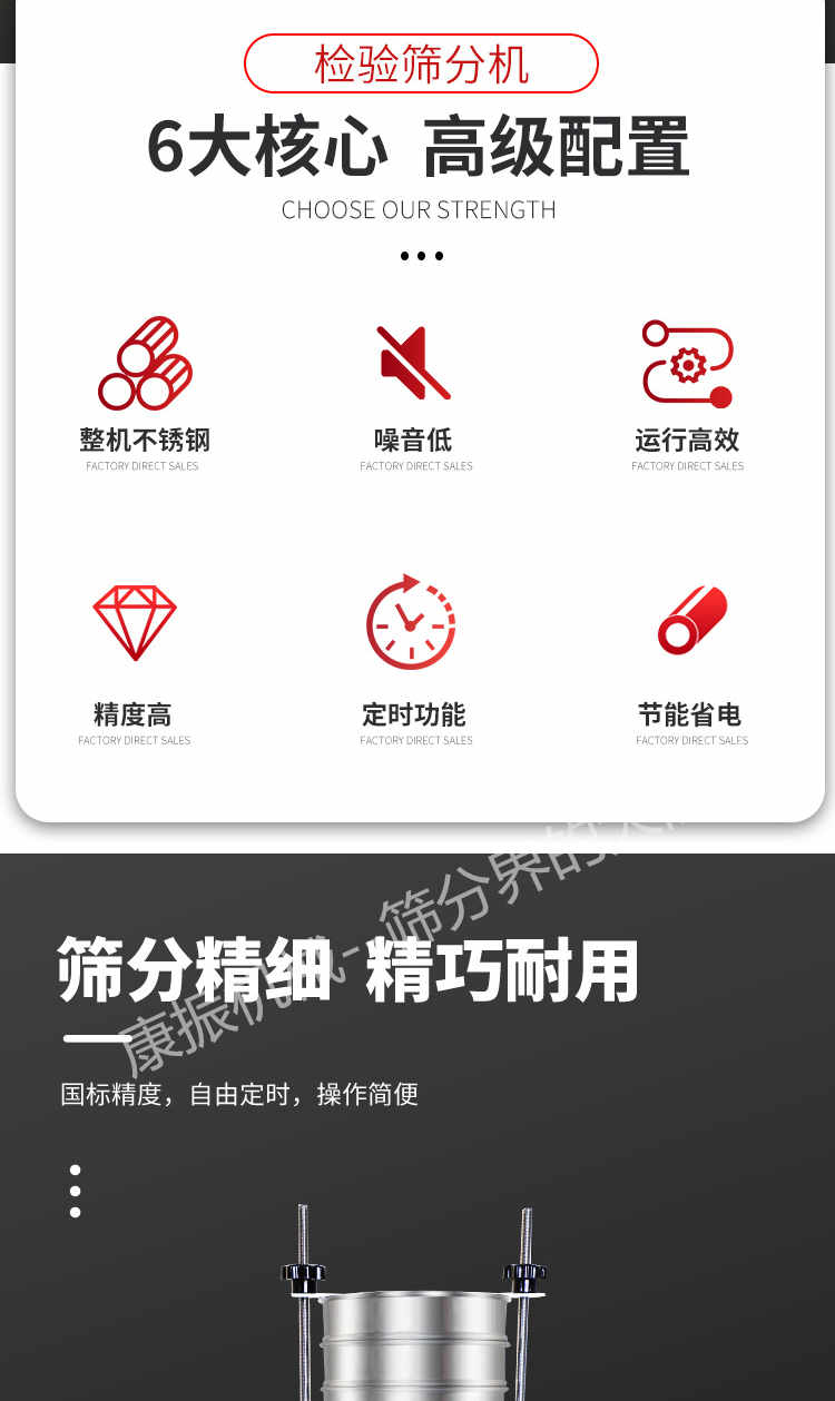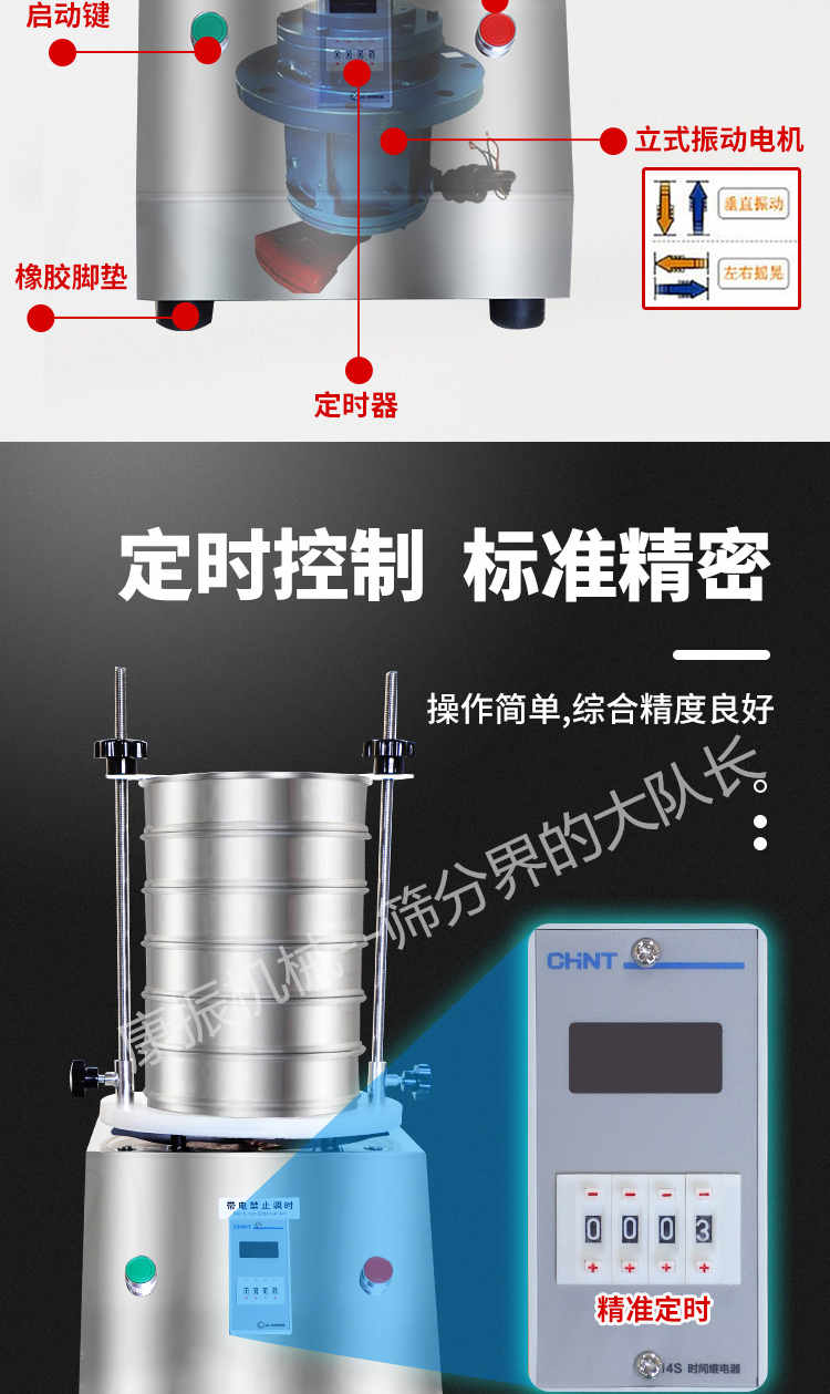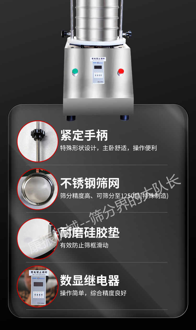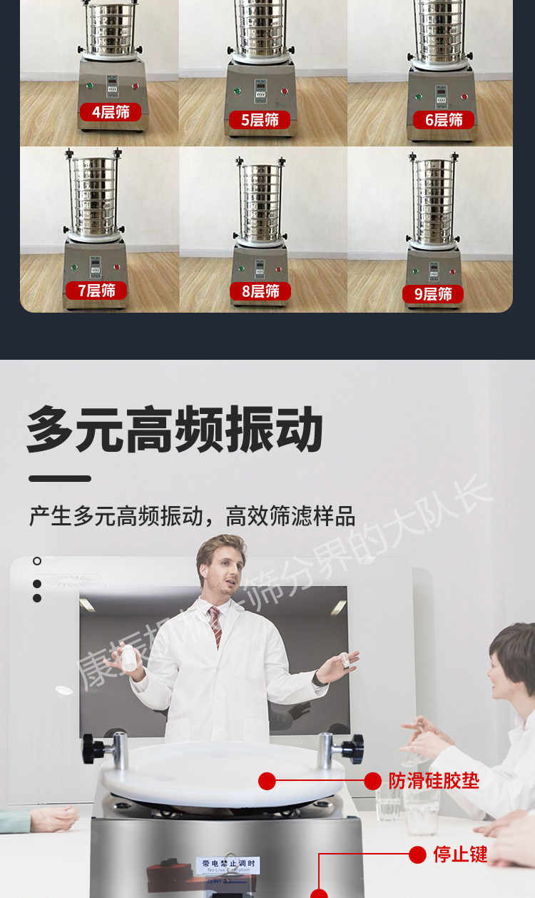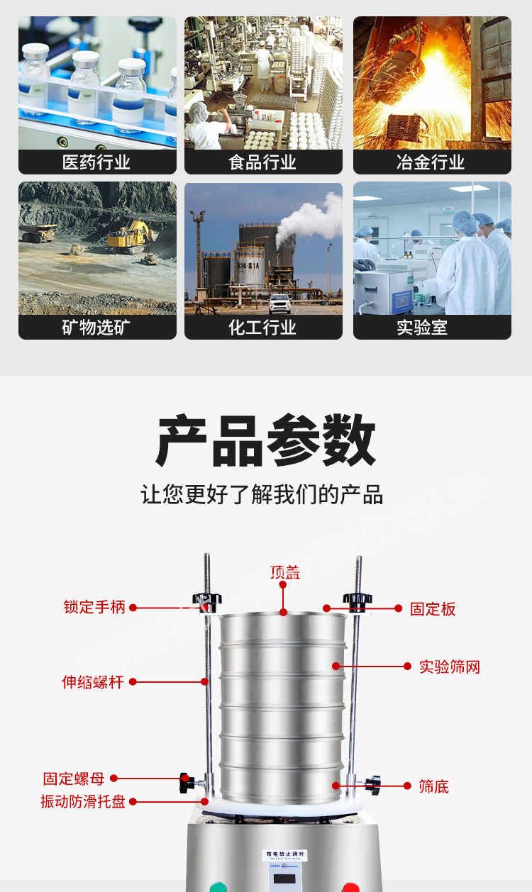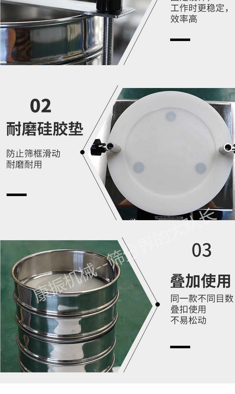 “機械篩分”將篩子按孔徑大小疊在一起,給料放在頂上一層篩子上,并加上蓋和底盤,一般疊56個篩子。然后放在機械振篩器上進行機械振動篩分。通常,振動時間為20分鐘。檢測篩分質量時,再用振篩器振篩器振篩5分鐘,如每分鐘篩下量小于0.2%試驗樣量即為合格,對于粗粒物料,過篩率小于1%即可。如篩分過程中損失量超過總篩分量的0.5%時,試驗必須重新取樣進行。為避免損失和延長篩分時間,有時在開始篩分時先用細的篩子將粉塵篩除