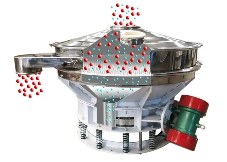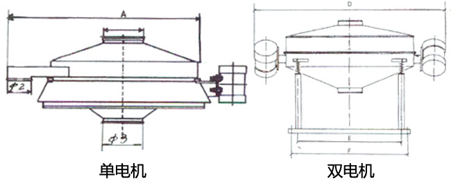 直排篩的作用原理是振動(dòng)電機(jī)軸上下端的兩組偏心塊(不平衡偏心塊),將振動(dòng)電機(jī)的旋轉(zhuǎn)運(yùn)動(dòng)變?yōu)樗健⒋怪薄A斜以及離心作用的多作用力重疊,再將這種作用力傳遞給篩面。改變上下偏心塊的相位角和可以改變激振力的大小和物料的運(yùn)動(dòng)軌跡。