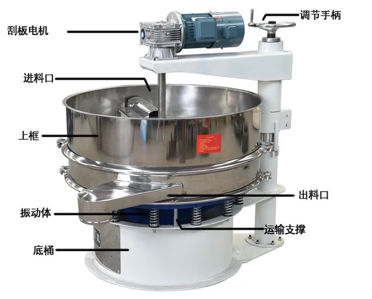 便于加強振動篩篩網(wǎng)的自清潔功能,例 如在面粉篩分中,有些細(xì)渣子易于掉落在網(wǎng)孔中,在刮板旋轉(zhuǎn)推動的作用下,