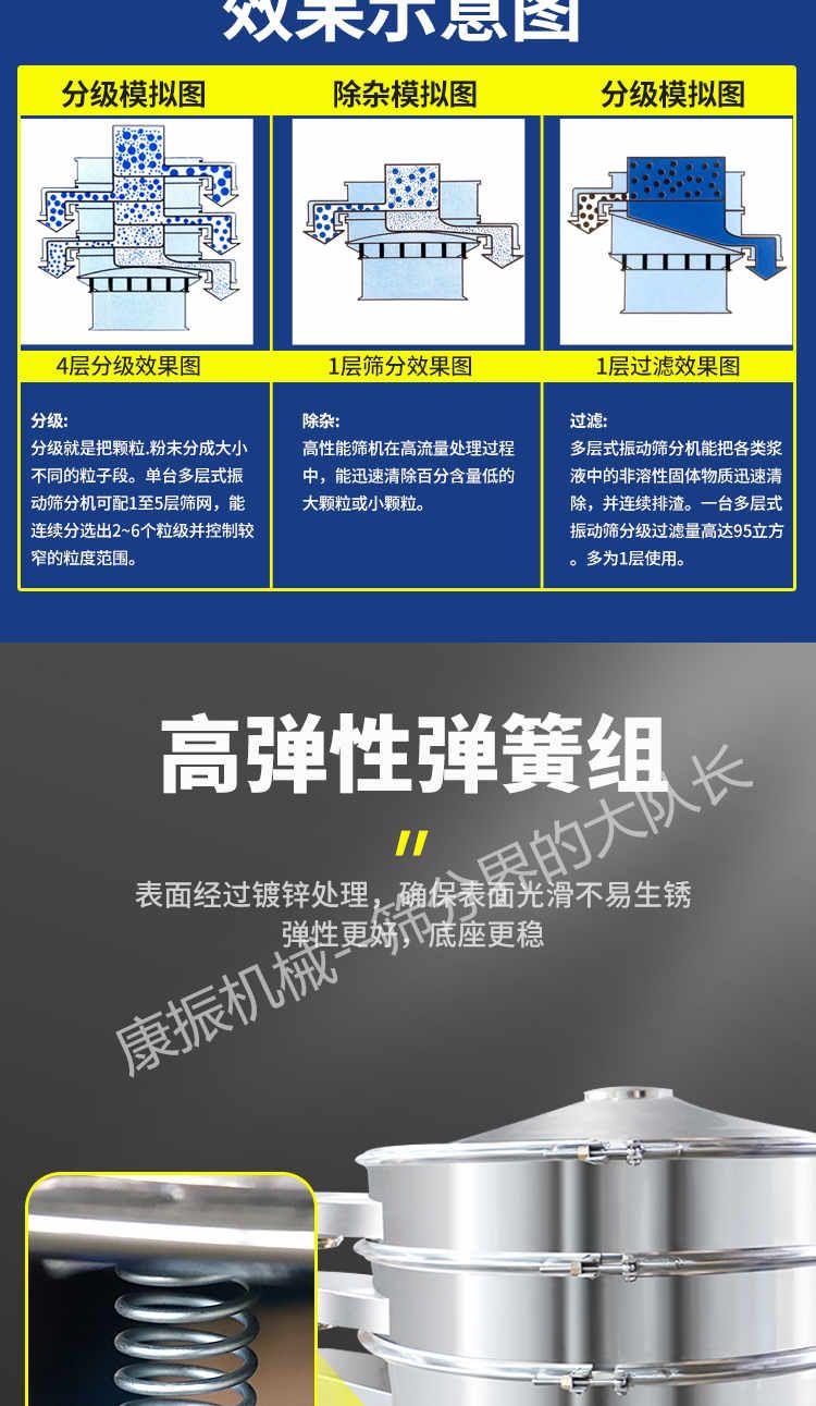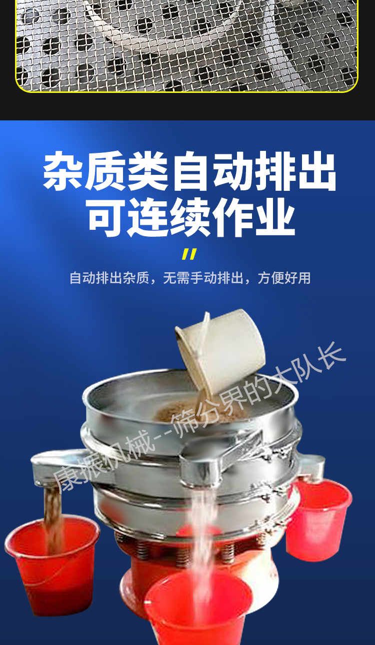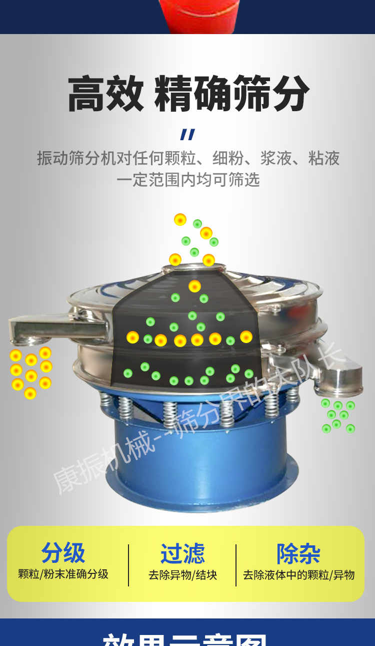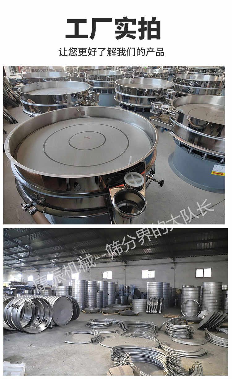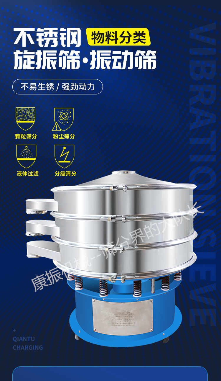 2、去液體:本設備單層、多層使用,可十分有效地處理固體、液體的混合物料。快速實現(xiàn)固液分離,并篩選過濾出不同的目的物料。