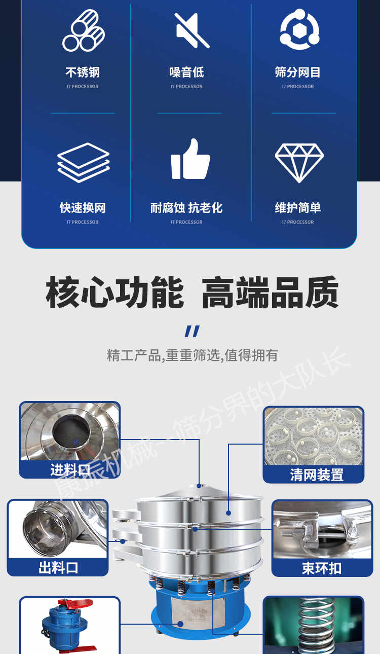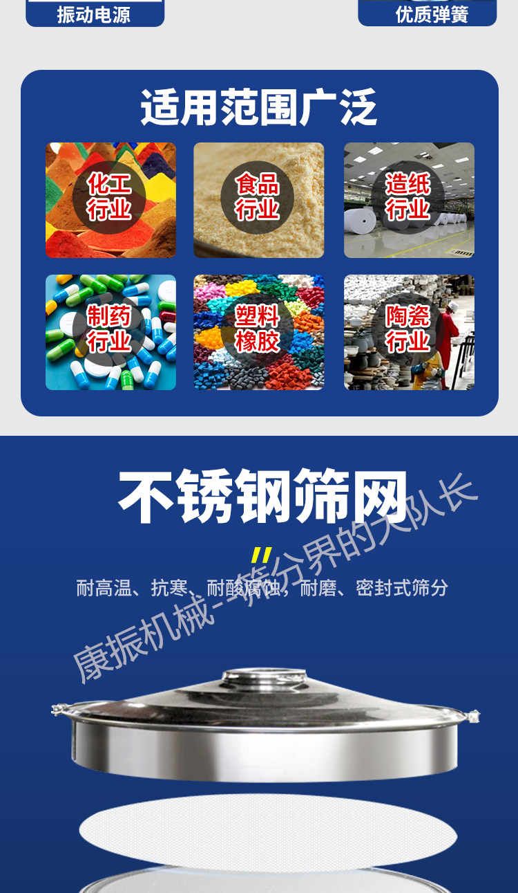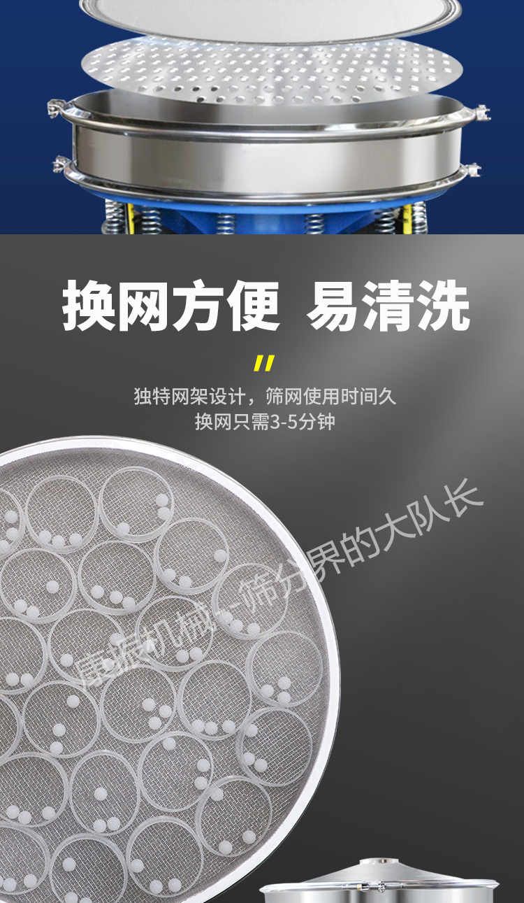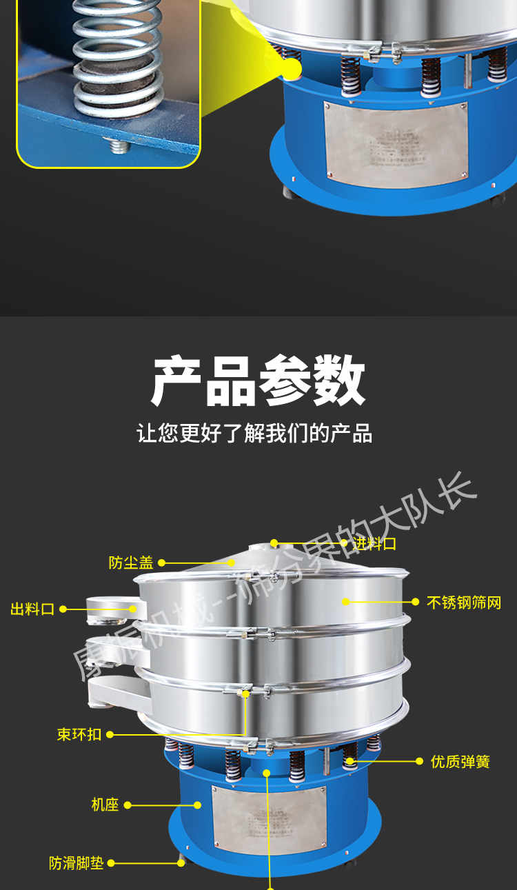 2、去液體:本設備單層、多層使用,可十分有效地處理固體、液體的混合物料。快速實現(xiàn)固液分離,并篩選過濾出不同的目的物料。